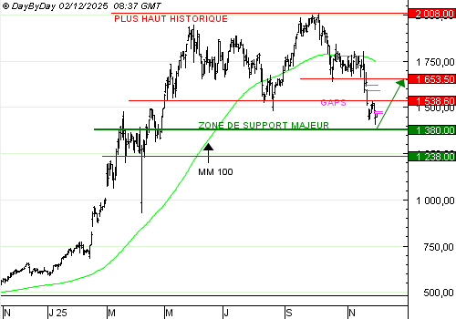 La rupture du support majeur à 1380 EUR invaliderait cette tendance.