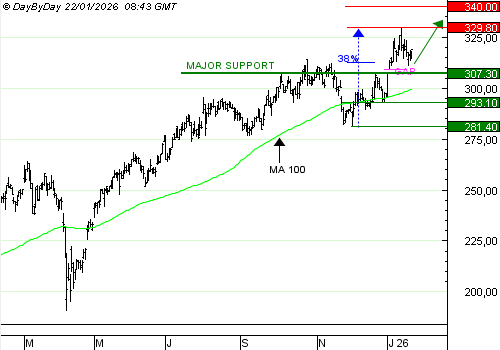 La rupture du support majeur à 307,3 EUR invaliderait cette tendance.
