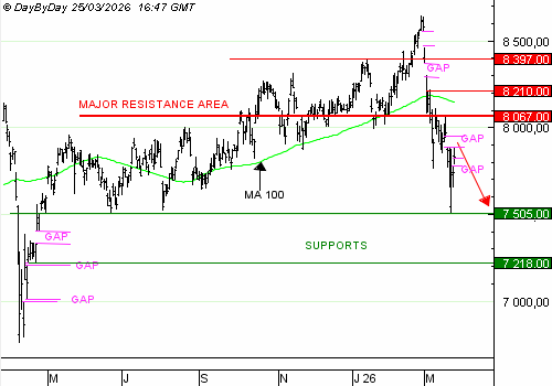 (ERRATUM pour mauvais mnémo) Le Cac 40 a fortement baissé en mars. Il se reprend légèrement depuis quelques jours, avec les espoirs d’une négociation entre USA et Iran. Portant, le dernier gap baissier, celui du 19 mars, n’est toujours pas comblé. L’indice avait bien commencé la journée ce matin, en ouvrant un gap haussier, mais ses velléités ont été contrées avec l’ouverture américaine. Les éléments positifs ont peu d’impact, ils n’arrivent pas encore à contrer l’accumulation d’éléments négatifs qui fait la tendance. Le Cac 40 devrait revenir à 7 505 points, voire enfoncer ce seuil pour rejoindre 7 218 points. Le franchissement de la résistance à 8 067 points invaliderait ce développement baissier.