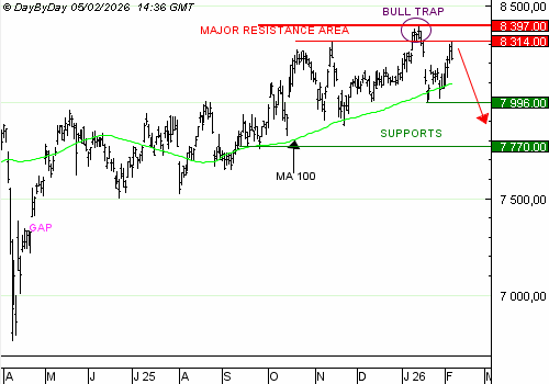 Début janvier, le Cac 40 était dans l’enthousiasme et il a rejoint un record proche de 8 400 points. Celui-ci a fait long feu. Le précédent record à 8 314 points a été réintégré, et suivi d’une baisse rapide, laissant planer un possible piège à haussiers. Aujourd’hui, alors que ce seuil a été testé une nouvelle fois, le CAC 40 a été rejeté avec force, et les indices américains font toujours preuve de faiblesse. Statistiquement, la probabilité pour que les actions françaises poursuivent un parcours haussier alors que les américaines faiblissent est très basse. Nous envisageons plutôt un retour vers le bas de la consolidation vaguement haussière des six derniers mois, à 7 770 points, avec une pause à 7 996 points. Le franchissement de la résistance à 8 397 points invaliderait ce développement baissier à court terme.
