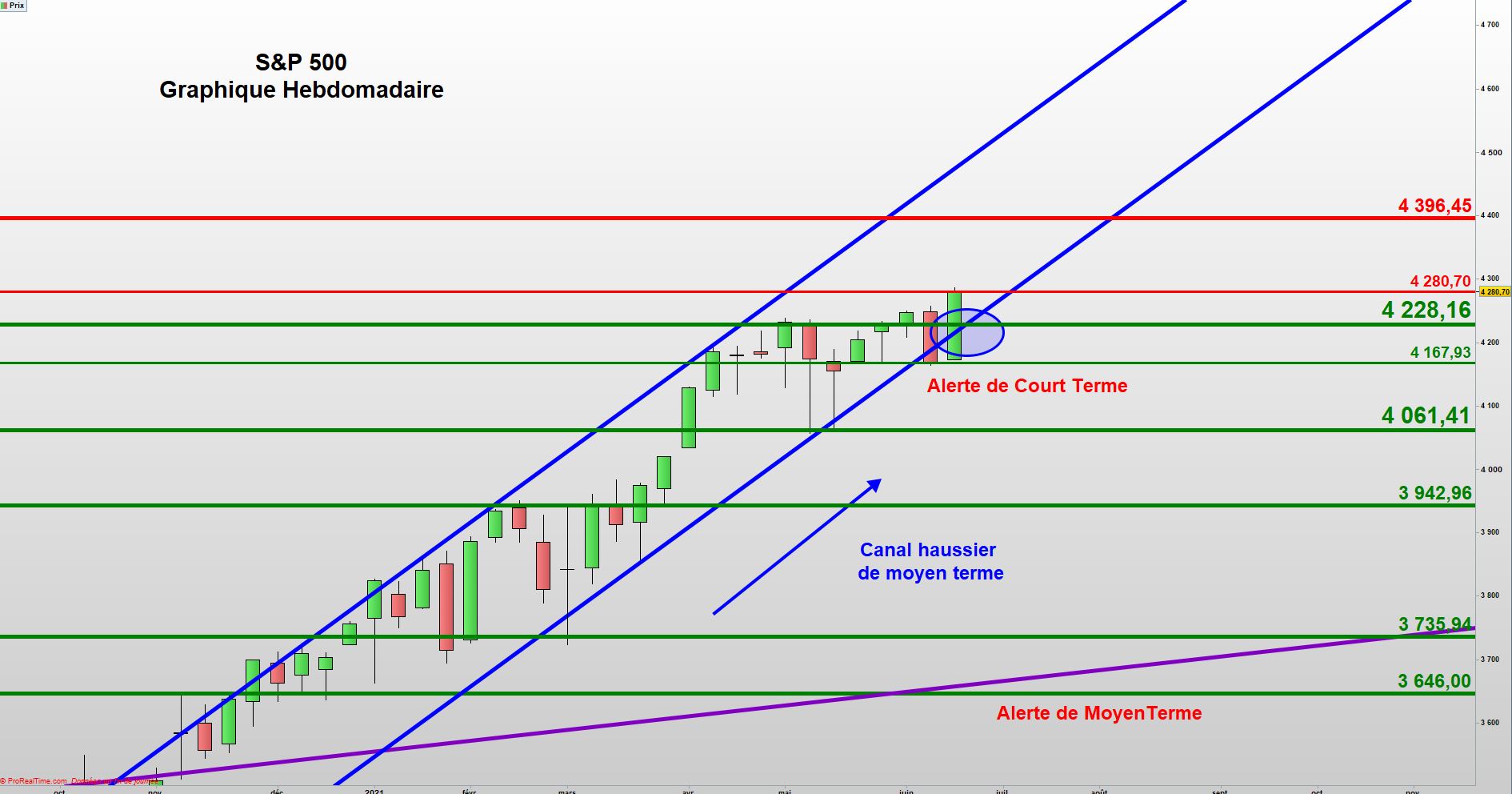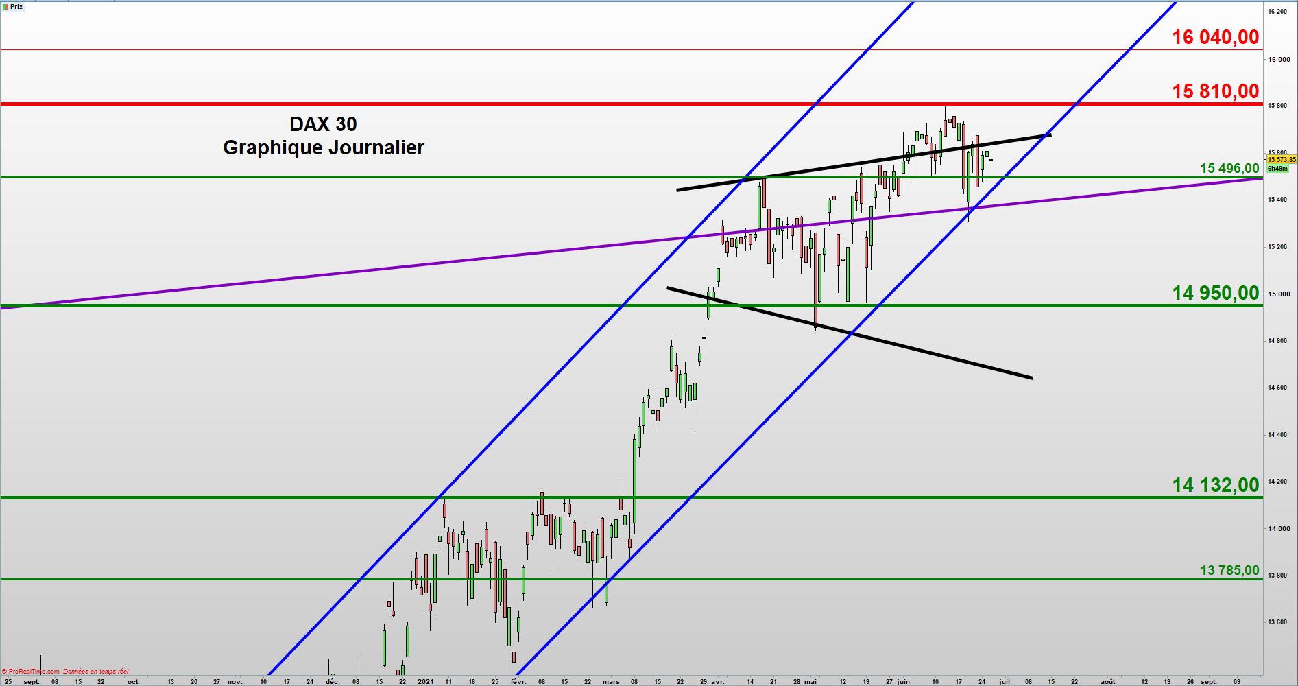 Ceci nous pousse à élargir légèrement, notre zone de neutralité, pour la séance du 29 juin. Elle se situe donc, entre l’ancienne borne haute d’un précédent biseau (en bleu) à 6524 et la résistance majeure à 6652,5.
