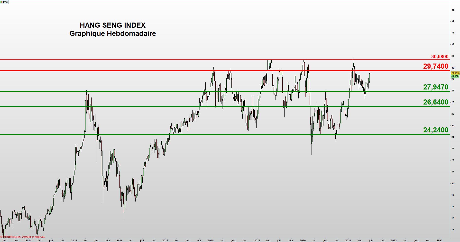 Ce signe de faiblesse et la rupture en clôture du support à 6583,5, confirme l’idée d’une évolution latérale, au moins, dans les jours à venir.