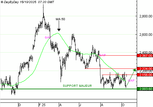 Avec les résultats meilleurs qu'attendus de LVMH, Hermès bondit et revient sur la résistance à 2156 euros qu'elle a du mal à franchir durablement depuis aout. Nous profitons de ce mouvement pour solder la position.