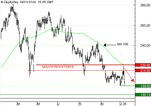 SAP a rapidement rejoint son précédent plus bas à 199,6 euros, et nous proposons donc de clôturer une partie de la position. La baisse a été très violente, le mouvement a des chances de faire une pause avant de reprendre plus tard.