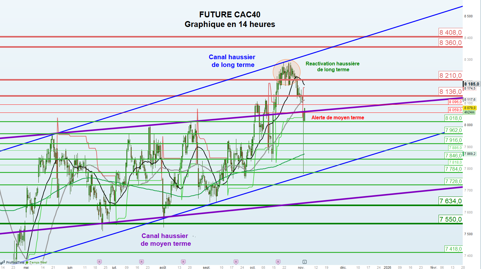 , le Future CAC 40 (cf. graphique en données 14 heures) a réintégré en gap baissier le canal baissier de moyen terme, dont la borne haute avait été franchie le 15 octobre, et est venu tester dès l’ouverture, de manière abrupte, la borne basse du canal haussier de long terme à 7 777 points. Une clôture sous 8 064 points indiquerait que le marché ne manifeste pas, dans l’immédiat, de volonté de mettre un terme à la phase de consolidation, malgré l’atteinte d’une cible graphique en début de séance. Une nouvelle rupture des 8 018 points, et plus précisément des 7 962 points, entraînerait une reprise du mouvement de baisse en direction des plus bas récemment enregistrés. Tant que ce niveau est préservé en clôture, le mouvement demeure canalisé, mais une cassure confirmée de ce seuil, suivie d’une rupture des 7 644 points, réactiverait la dynamique baissière en direction des 7 050 points.