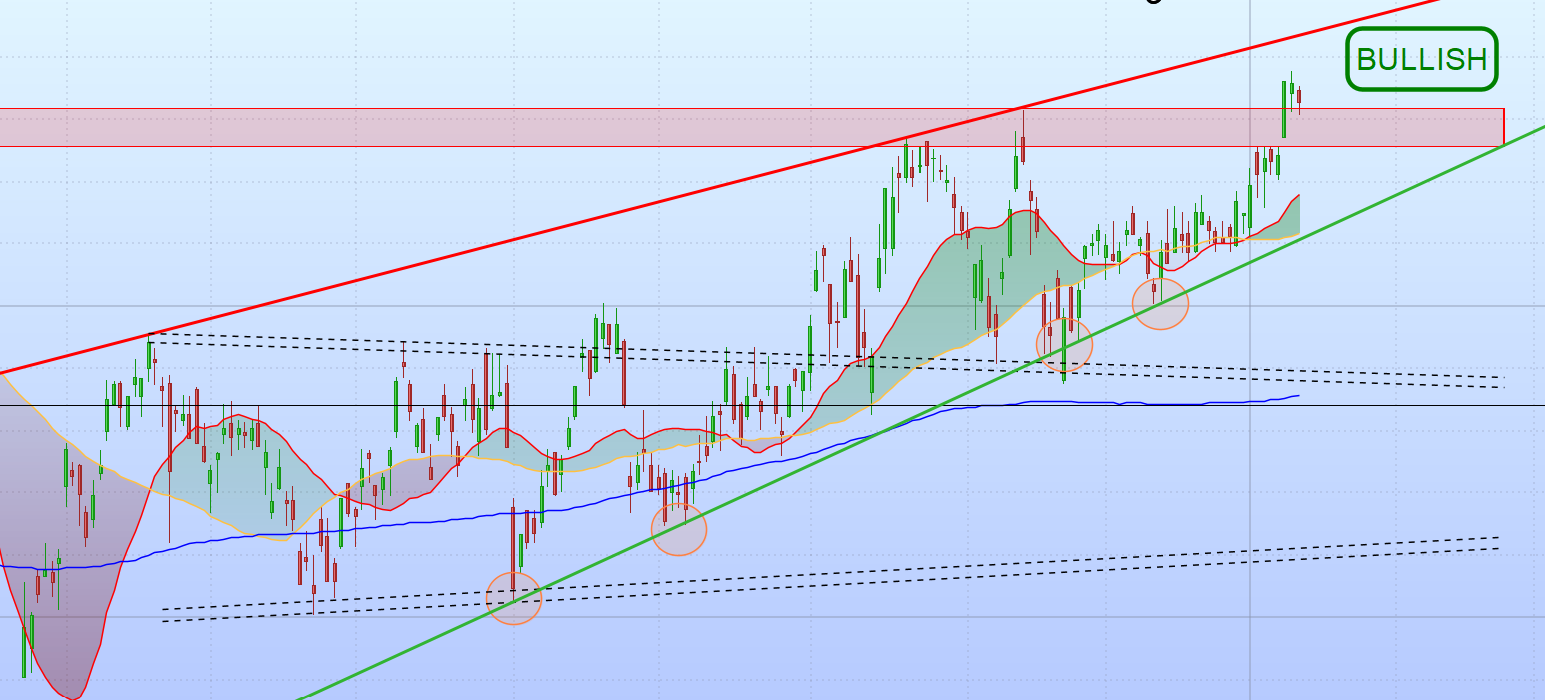 Du coté des indicateurs, l’indice évolue au-dessus de sa moyenne mobile 20, 50 et 200, les histogrammes du MACD oscillent à la baisse au-dessus de sa ligne de signal, le RSI est en neutre tandis que les volumes sont en hausses par rapport à la séance de la veille.