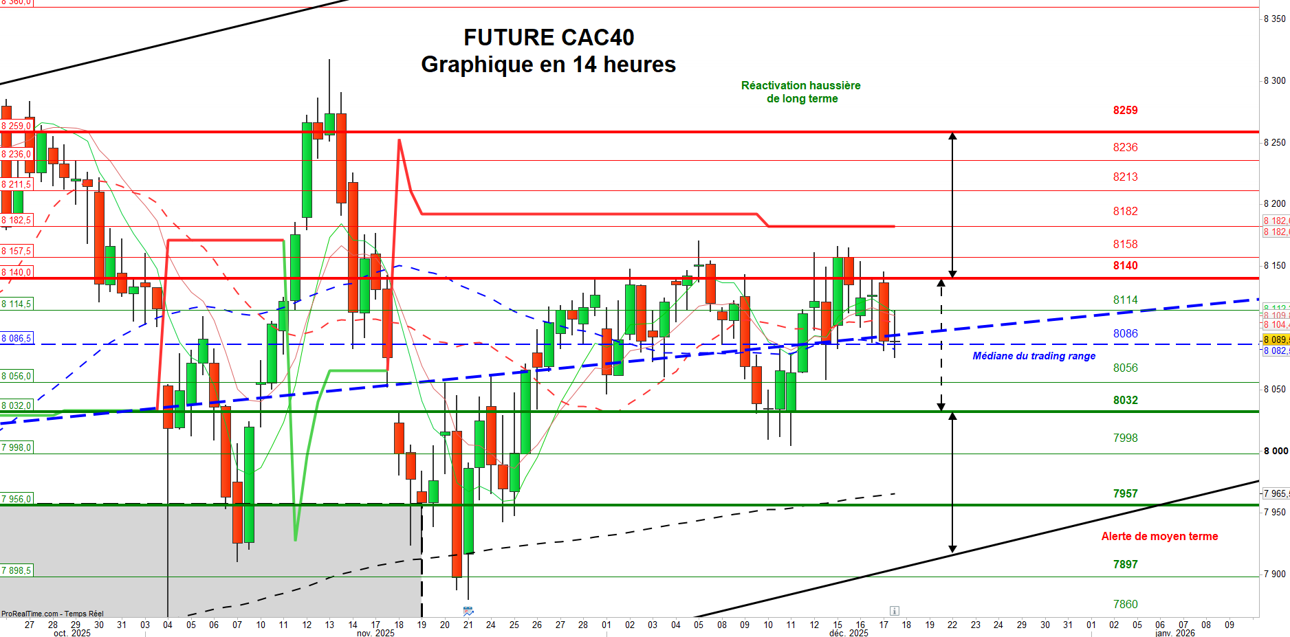 , le Future CAC 40 (cf. graphique en données 14 heures) évolue dans une phase de stabilisation, au sein d’un trading range compris entre 8032 et 8140 points. La dynamique reste légèrement haussière, mais manque de momentum et peine à s’accélérer depuis la fin du mois de novembre.