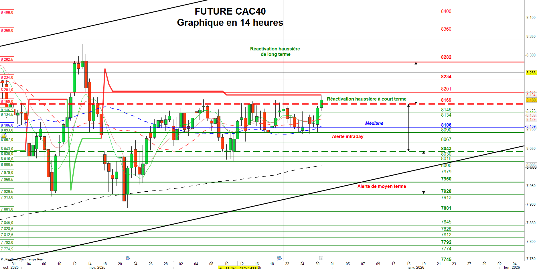 À l’inverse, un retour sous 8169 points, suivi d’une clôture sous la zone des 8146 / 8134 points, fragiliserait, voire invaliderait, la tentative de relance en cours.