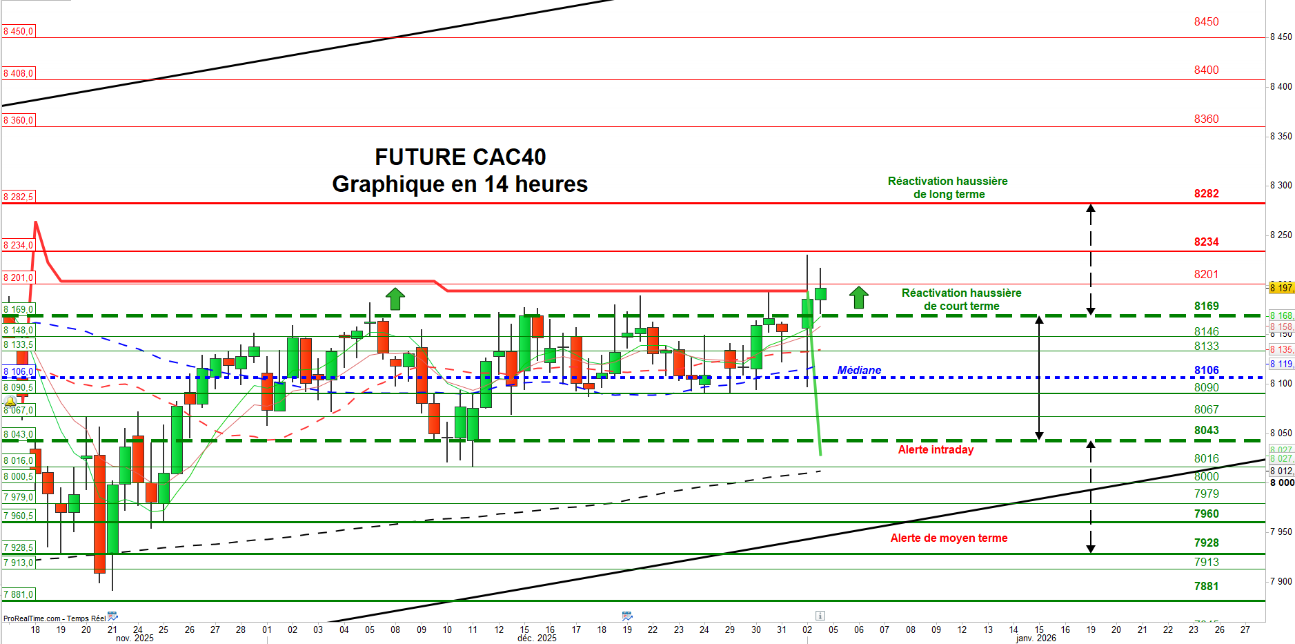 À l’inverse, un retour sous le seuil des 8169 points fragiliserait de nouveau la dynamique en cours et exposerait le marché à un possible retour vers la médiane du trading range, située à 8106 points. La cassure de cette ligne centrale, qui matérialise la zone d’équilibre du range, ouvrirait alors la voie à un repli en direction de la zone d’alerte intraday située à 8043 points.
