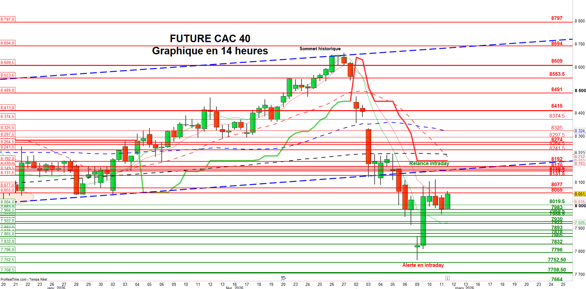 Graphiquement, le future CAC 40 (données à 14h) montre des signes de fébrilité. La fermeture partielle du gap haussier ouvert la veille suggère que l’impulsion enregistrée le 10 mars n’a pas suffi à installer une dynamique suffisamment solide. L’indice n’est notamment pas parvenu à réintégrer le canal haussier de long terme, nettement enfoncé le 5 mars.