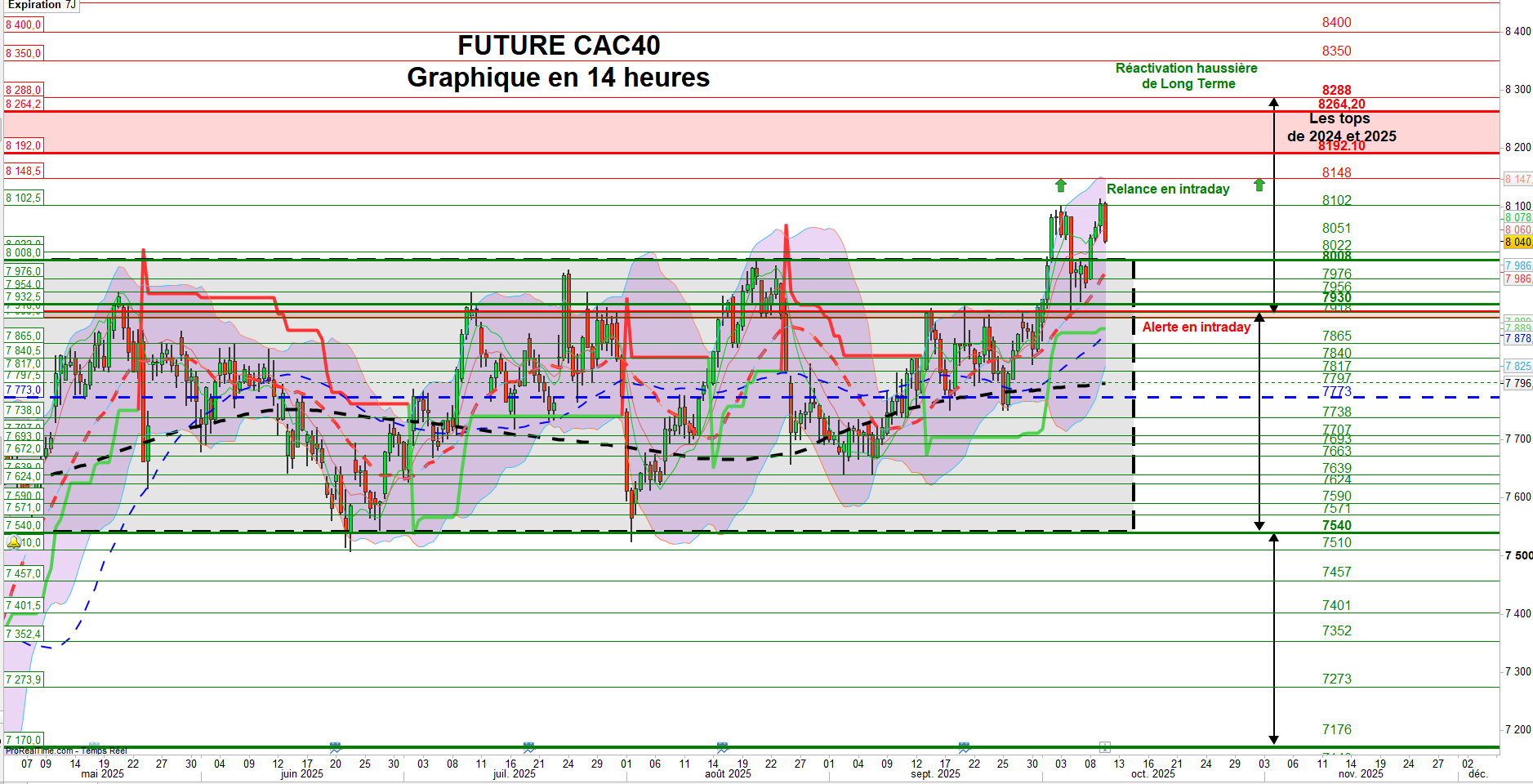 Si ce scénario se confirmait, le franchissement de cette zone ouvrirait la voie à une poursuite du rebond en direction du sommet de 2025 à 8192,10 points, voire du record historique sur le future à 8264,2 points, avec une possible extension vers 8290/8300 points.