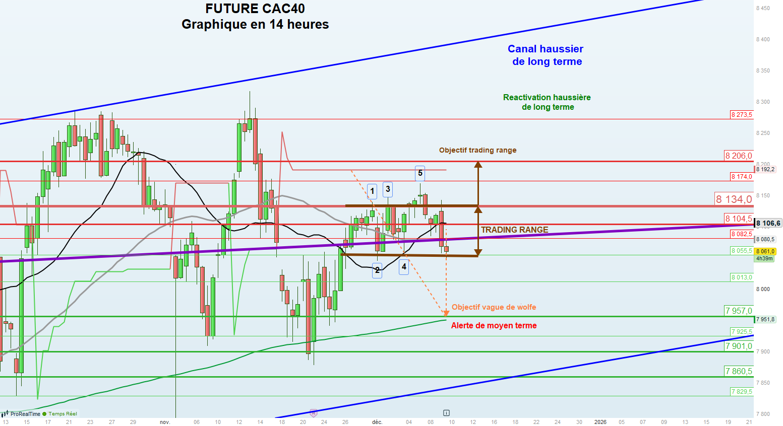 Graphiquement, le Future CAC 40 (cf. graphique en données 14 heures) a réintégré le trading range délimité entre 8 055,5 et 8 134 points, configuration latérale en vigueur depuis le 26 novembre, après une fausse échappée haussière rapidement avortée en fin de semaine dernière. L’indice évolue désormais dans une vague de Wolfe baissière, dont la cible théorique se situe à 7 957 points. Tant que ce niveau d’alerte de moyen terme demeure préservé en clôture, la pression vendeuse reste contenue. En revanche, une cassure de ce support raviverait la dynamique baissière et orienterait les cours vers la partie inférieure du canal haussier de long terme, actuellement positionnée à 7 843 points. La rupture de cette oblique structurante, couplée à celle de la zone de soutien comprise entre 7 696 et 7 644 points, ouvrirait la voie à une accélération baissière marquée en direction de la ligne de cou du triple top située à 7 048 points.