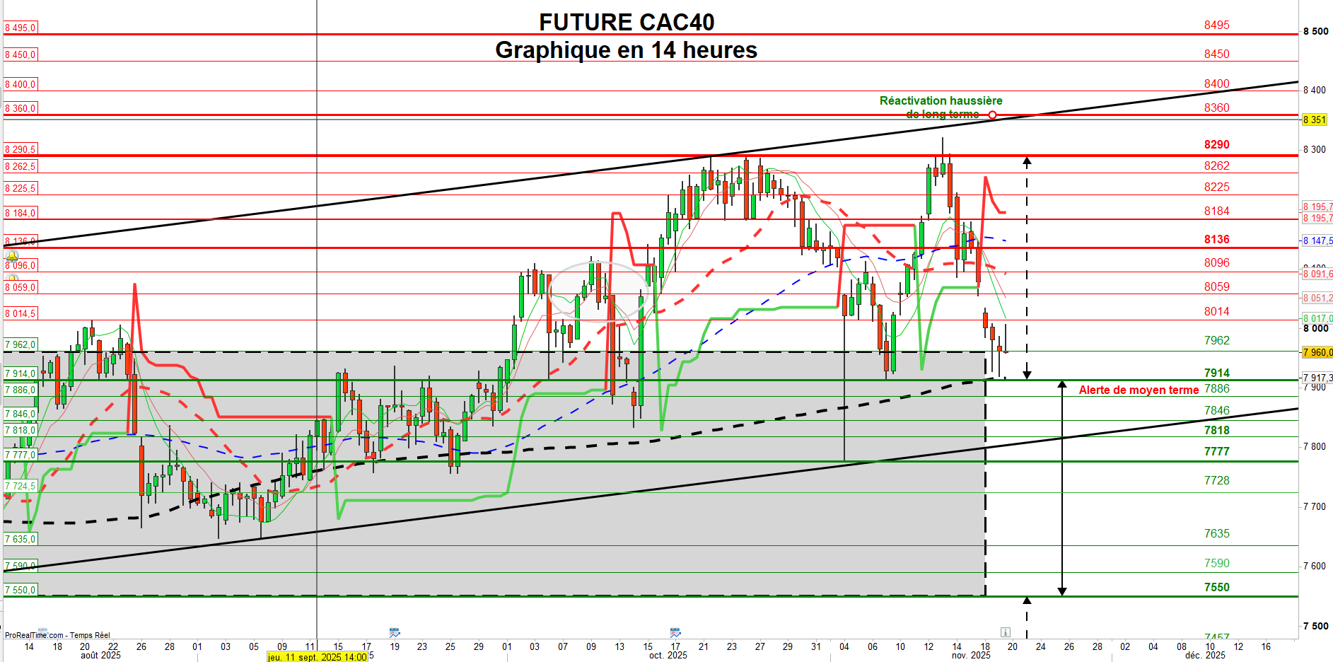 A l’inverse, Le retour sous la zone d’alerte de moyen terme située à 7914 points ferait basculer l’indice dans un flux baissier plus marqué, avec pour premiers objectifs la partie basse du canal haussier de moyen terme autour de 7800 points, une zone susceptible de provoquer une réaction technique. À défaut de rebond sur ce niveau, la correction se prolongerait vers les supports suivants à 7700/7600 points, avant qu’une rupture franche des 7500 n’ouvre la voie à un repli plus profond en direction de la ligne de cou du triple top hebdomadaire à 7050 points.