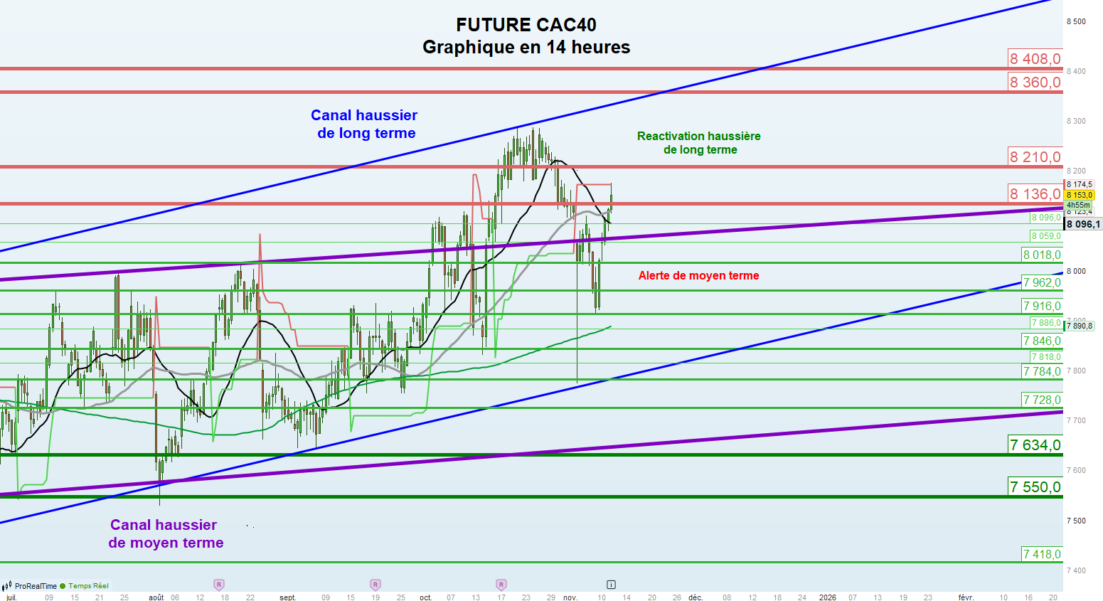 Graphiquement, le Future CAC 40 (cf. graphique en données 14 heures) est parvenu une nouvelle fois à s’extraire de la partie haute du canal haussier de moyen terme, qu’il avait réintégré par un gap baissier lors de la séance du 4 novembre. Un franchissement en clôture de la résistance majeure située à 8 136 points mettrait un terme au mouvement de consolidation initié à proximité des 8 300 points et réactiverait la dynamique haussière de court terme en direction des plus hauts historiques. Un franchissement en force et en clôture des 8 360 points raviverait la tendance haussière de long terme, avec pour objectif les 9 364 points, niveau issu de la réplication de la précédente phase de congestion.
