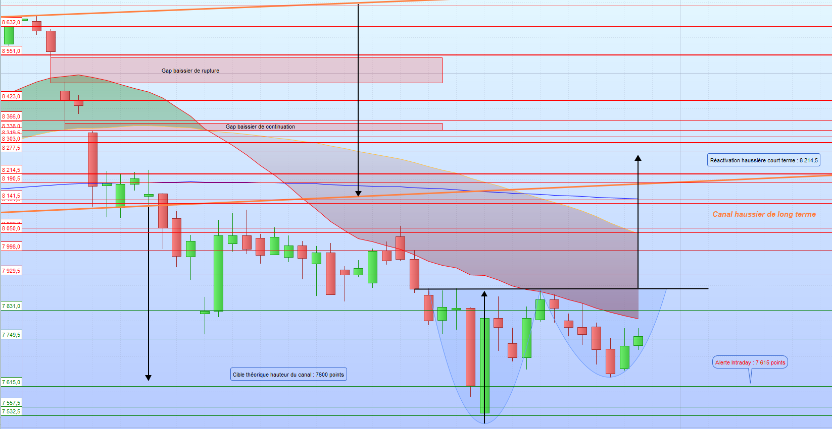 Les supports sont : 7831 puis 7749,5 voire 7615 et 7557,5 puis 7532 et 7398,5