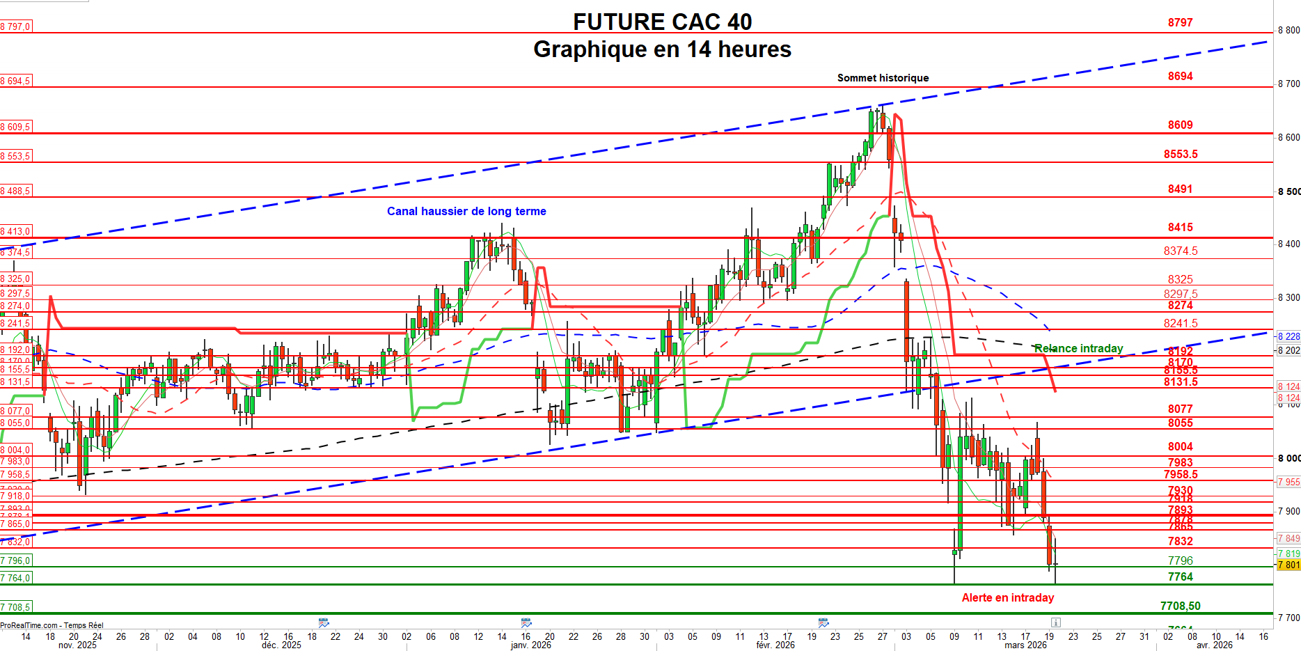 L’indice a ainsi accéléré son repli vers les niveaux récemment testés. Le premier support, situé à 7 831 points, a été enfoncé, tandis que le second, correspondant au point bas du 9 mars à 7 764 points, a servi de point d’appui pour initier un rebond technique.
