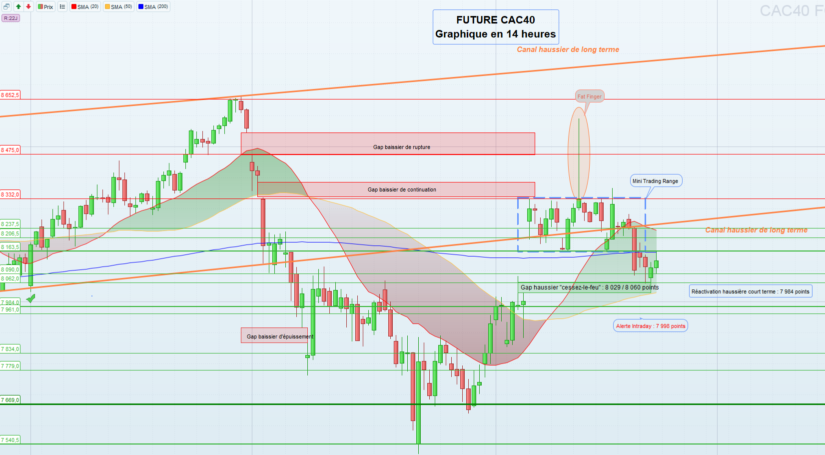 Graphiquement, le future CAC 40 (données à 14h) parvient à se maintenir à flot, porté par un retour des acheteurs après trois séances consécutives de repli ayant entraîné un recul cumulé supérieur à 3 %. La tendance haussière de court terme demeure toutefois préservée tant que l’indice évolue au-dessus du seuil des 7 984 points. L’indice a partiellement refermé ce jour le gap haussier ouvert à la suite de l’annonce du cessez-le-feu, avant de repartir à la hausse en prenant appui sur sa moyenne mobile à 50 jours (SMA50). Le franchissement net, confirmé en clôture, de la borne basse de l’ancien range de consolidation situé à 8 163,5 points constituerait un premier signal encourageant. Il ouvrirait alors la voie vers les prochaines résistances localisées à 8 206,5 puis 8 237,5 points. La concrétisation de ce scénario supposerait néanmoins un retour plus marqué des flux acheteurs, accompagné d’un environnement géopolitique plus favorable. Une réintégration de l’indice à l’intérieur de son canal haussier de long terme permettrait ensuite d’envisager la fermeture du gap de continuation compris entre 8 336 et 8 358 points. Dans un second temps, le comblement du gap de rupture situé entre 8 473,5 et 8 544 points viendrait renforcer les perspectives positives, avec en ligne de mire la borne haute du canal de long terme, située aux alentours de 8 800 points.