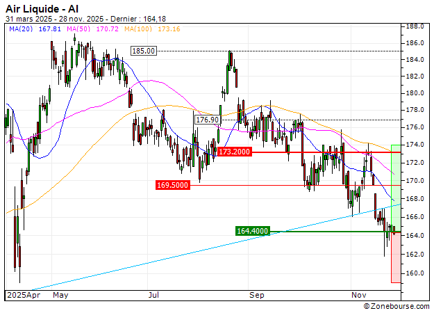Le seuil des 164.4 EUR pourrait, en effet, permettre une remobilisation du consensus acheteur et engendrer une reprise technique en direction des 174 EUR.