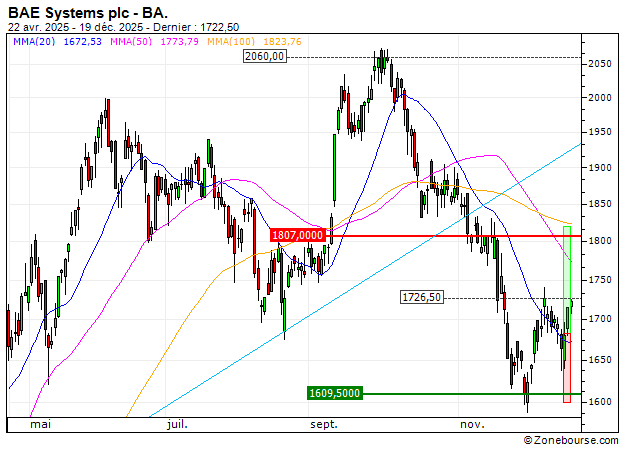 (Zonebourse.com) Techniquement, le titre BAE Systems plc se situe proche de son support des 1609.5 GBX. La configuration technique actuelle permet d'envisager un rebond significatif. Le niveau de…