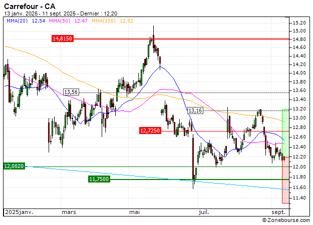 L'action Carrefour atteint des territoires survendus à l'approche d'un niveau important situé vers 12 EUR. Cette situation accrédite la possible mise en place d'un rebond technique du titre. Ainsi, les cours pourraient retrouver de la vigueur et s'orienter en direction de la prochaine résistance située à 13.5 EUR.
