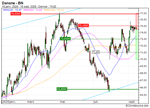 La reprise technique dernièrement observée sur Danone devrait trouver un point d'arrêt dans la zone de cours actuelle. Le timing apparaît pertinent pour anticiper le retour d'une dynamique baissière, avec les 70 EUR comme principal objectif.
