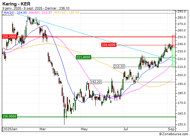 Le titre est en situation de surachat, à proximité d'une résistance court terme située à 238.6 EUR. Le timing est adéquat pour se placer vendeur sur Kering en anticipant une reprise de la tendance de fond baissière en direction des 210 EUR.
