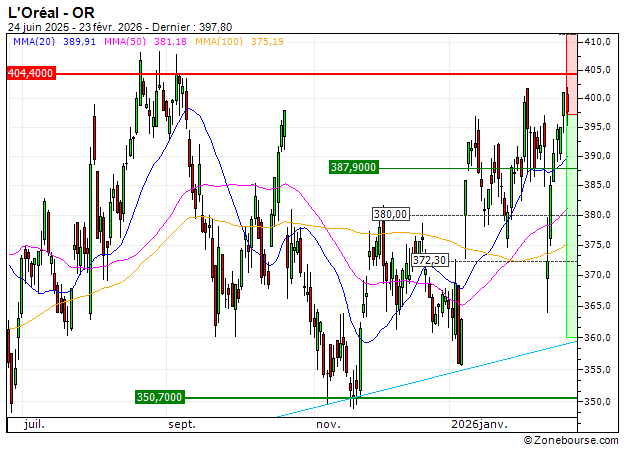 Le titre L'Oréal a connu une période de rebond ces dernières séances en direction de la résistance moyen terme des 404.4 EUR. Cette zone pourrait déclencher un signal de vente pour les investisseurs tentés de prendre leurs bénéfices sur la valeur, d'autant plus que les indicateurs techniques mettent en évidence une situation de surachat.