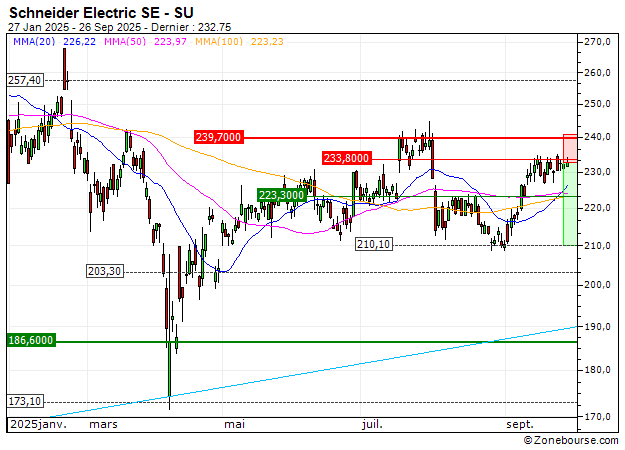 Le titre Schneider Electric SE montre actuellement quelques signes d'essoufflement au contact des 233.75 EUR et pourrait amorcer une nouvelle phase de consolidation dans les séances à venir. Les récentes révisions baissières des perspectives de bna et la configuration technique laissent présager d'un retour sur les 210 EUR à brève échéance.