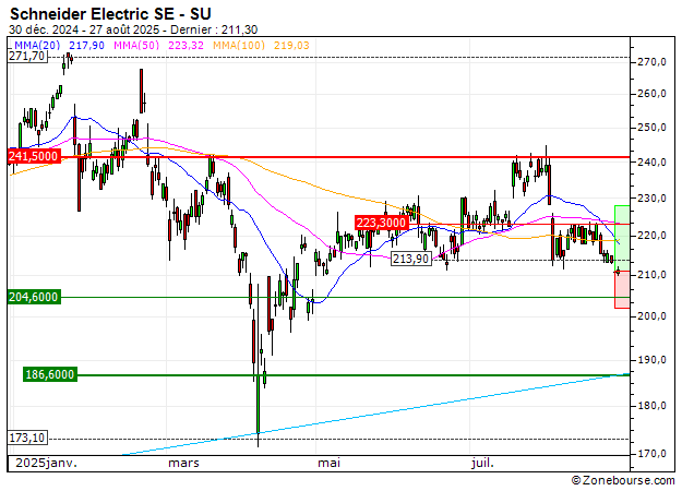 Techniquement, le titre Schneider Electric SE se situe proche de son support des 204.6 EUR. La configuration technique actuelle permet d'envisager un rebond significatif. Le niveau de survente des indicateurs complète les critères positifs du sous-jacent.