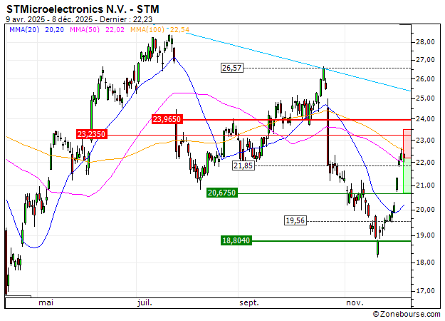 Le titre STMicroelectronics N.V. montre actuellement quelques signes d'essoufflement au contact des 23.24 EUR et pourrait amorcer une nouvelle phase de consolidation dans les séances à venir. Les récentes révisions baissières des perspectives de bna et la configuration technique laissent présager d'un retour sur les 20.7 EUR à brève échéance.