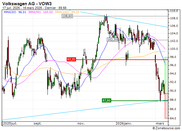 L'action Volkswagen AG atteint des territoires survendus à l'approche d'un niveau important en données quotidiennes situé vers 87.8 EUR. Cette situation accrédite la possible mise en place d'un rebond technique du titre. Ainsi, les cours pourraient retrouver de la vigueur et s'orienter en direction des 98 EUR.